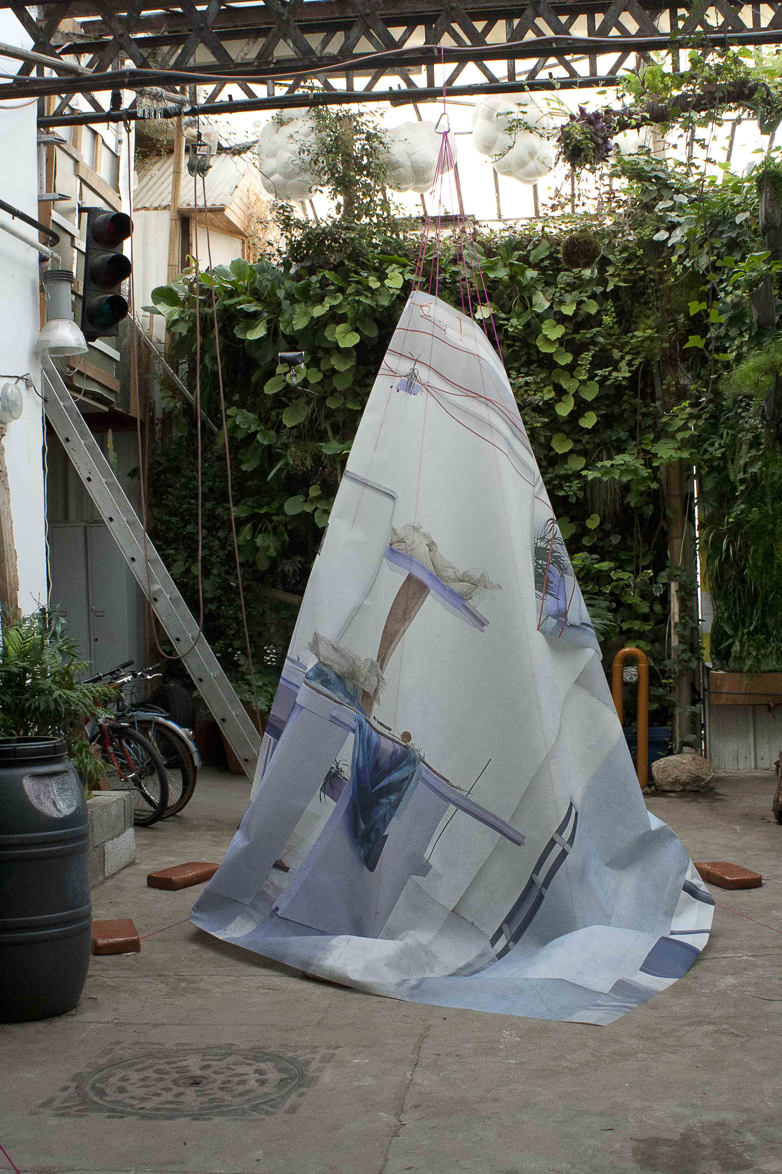 Impressions sur tissus, ficelle, mousquetons, terre huilée